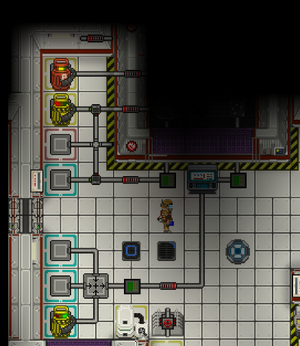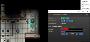 Теперь, подготовьте установку для нагрева форона. Логика здесь состоит в следующем: через камеру проходят трубы теплообмена. На вход теплообменного контура прикрутите канистру с фороном. К выходу прикрутите пустую канистру. Пока что не включайте насосы контура. В трубах, которые ведут из восточного, западного и южного портов еще сохранился газ. Отсоедините все канистры от портов, выставите эти порты на вход, а восточный порт на выход. Запустите насос на трубе, ведущей из восточного порта на максимум. Если всё сделано правильно, то камера постепенно заполнится газом. Контролируйте давление в трубах с помощью газового анализатора. Как только давление в трубах приблизится к нулю, отключите насос и перенастройте газовый миксер: южный порт на вход, пропорция для него - 100%, восточный порт на выход. Подключите желтую канистру с зажигательной смесью к южному порту, включите насос и подождите, пока канистра не опустеет, а камера не заполнится