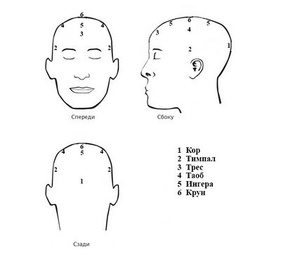 - Ингера – области спереди и сзади от макушки: источник честности и этики, воли и вялости, смелости и трусости, связана с языком и чувством вкуса.