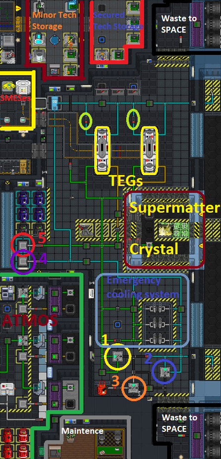 Альтернативой является сокращение потребления Atmospherics Subgrid и Engine Core Subgrid вместе. Вы можете это сделать в отсеке СМЕСов, перерезав кусачками провода, выходящие из Core SMES и Atmos SMES, затем соединив их друг с другом Самое простое место для этого - это место, где они проходят рядом друг с другом, отмечено на рисунке справа.